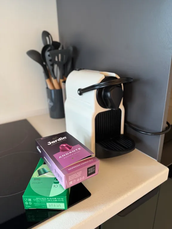 Кухня - плита, чайник, холодильник, караульная, кофемашина, весь комплект посуды и приветственный набор: вода, чай и кофе, соль, сахар.