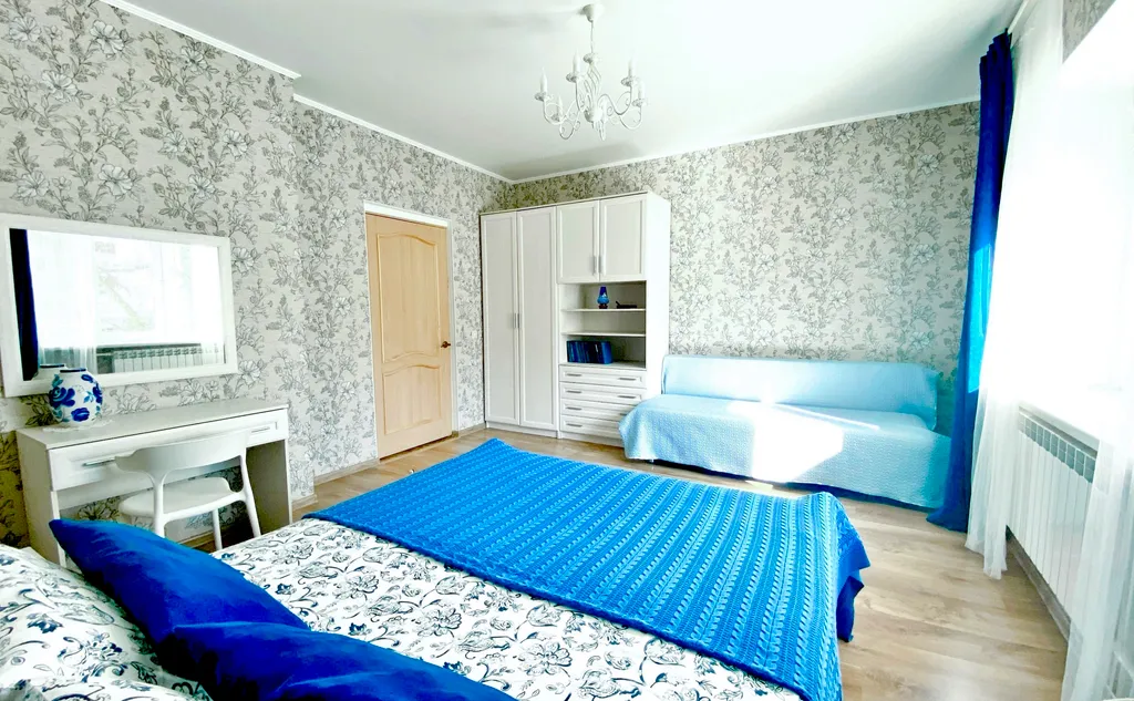 - Двуспальная кровать (160 см), два раскладных дивана (140 см), раскладушка (по запросу!). Постельное белье 100% хлопок!
