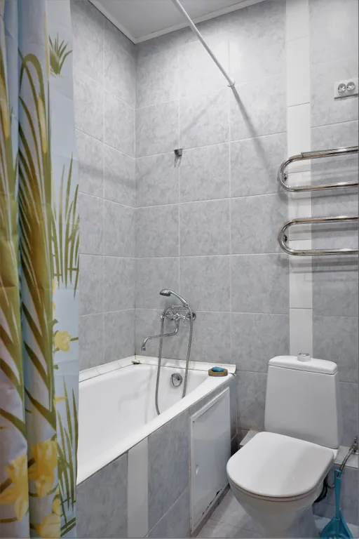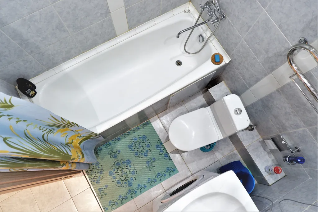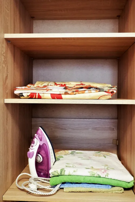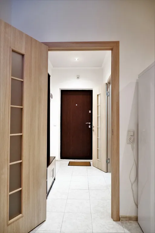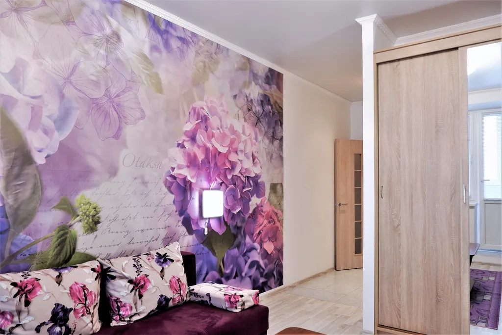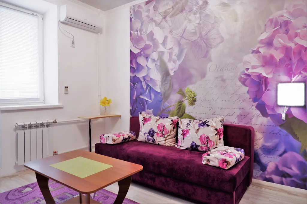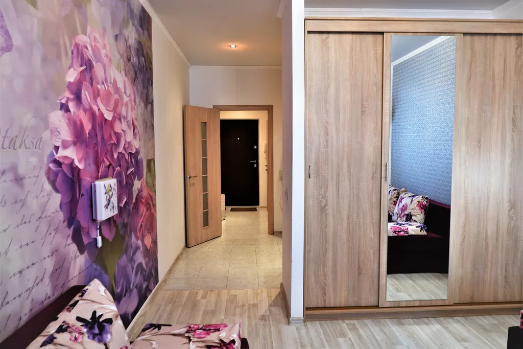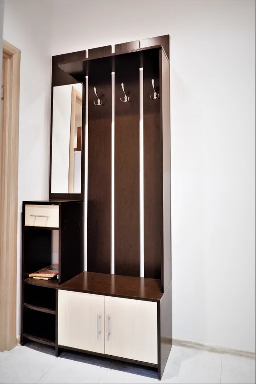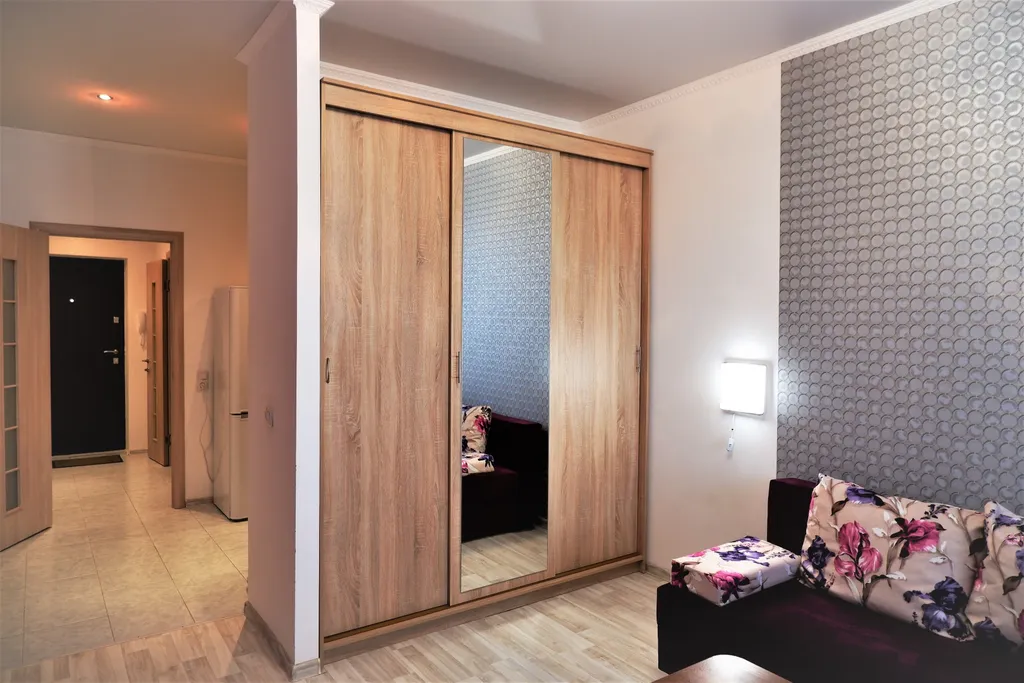 Два двуспальных дивана, большой шкаф-купе для вещей, два пристенных столика, обеденный стол, четыре табурета, встроенная кухня, компактная прихожая.
